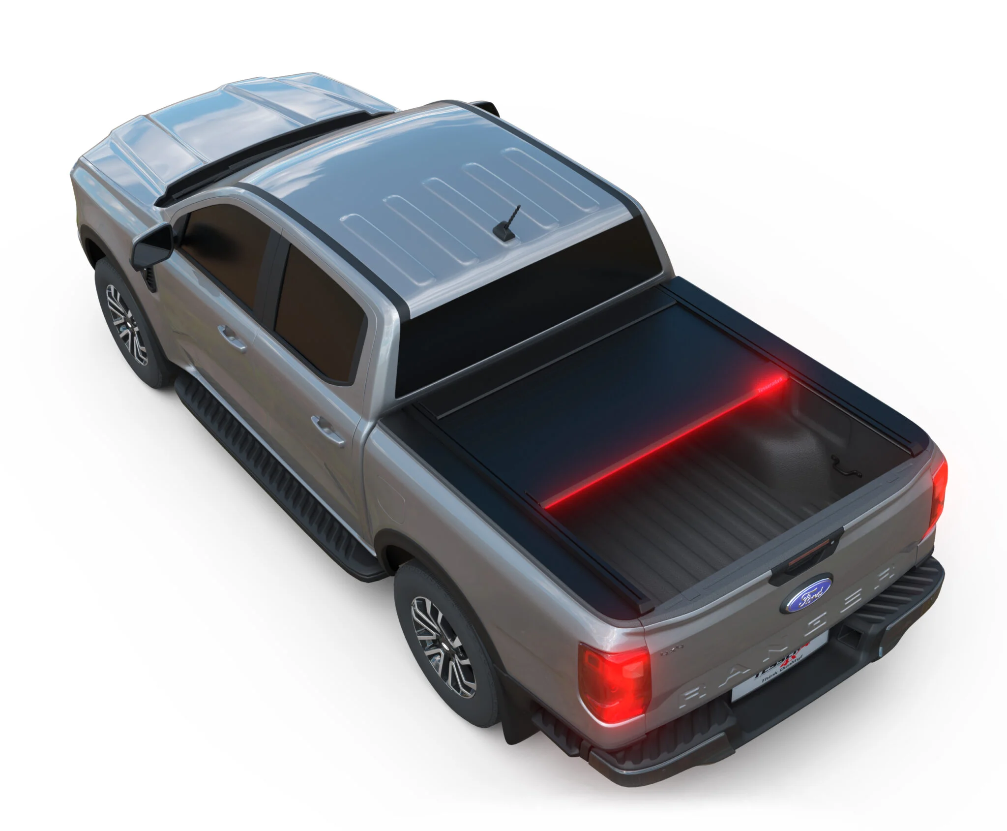 | b) Full-Length Moving White LED Light Bar Tessera Roll+ features a unique, full-length white LED light bar embedded in the moving end slat. It dynamically illuminates any place of the trunk bed, ensuring optimal lighting no matter the load. Unlike competitors' fixed side or front lights, which can be easily obstructed, our moving LED light guarantees full visibility and c onvenience in any situation. | ✓ | ✓ | X |